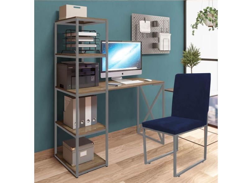 Kit Escritório Mesa Max BeX 5 Prateleiras e Cadeira Stan Prata Tampo Madeira Corino Azul Marinho - Ahz Móveis