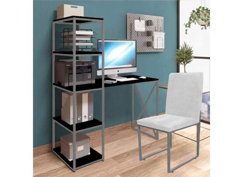 Kit Escritório Mesa Max BeX 5 Prateleiras e Cadeira Stan Prata Tampo Preto Sintético Branco - Ahz Móveis
