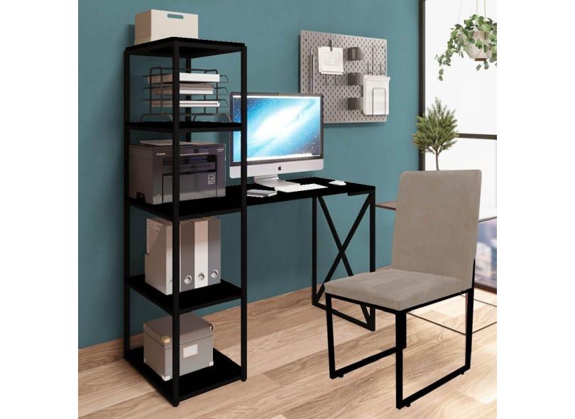 Kit Escritório Mesa Max BeX 5 Prateleiras e Cadeira Stan Preto Tampo Preto Corino Bege - Ahz Móveis