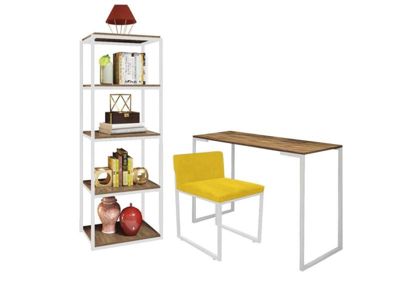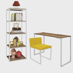 Kit Escritório Ravi 1 Cadeira Suede Amarelo com 1 Mesa e 1 Livreiro Ferro Branco MDF Rústico - Ahazzo Móveis