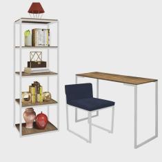 Kit Escritório Ravi 1 Cadeira Suede Azul Marinho com 1 Mesa e 1 Livreiro Ferro Branco MDF Carvalho - Ahazzo Móveis