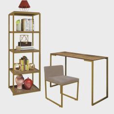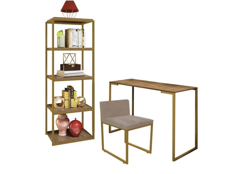 Kit Escritório Ravi 1 Cadeira Suede Bege com 1 Mesa e 1 Livreiro Ferro Dourado MDF Carvalho - Ahazzo Móveis
