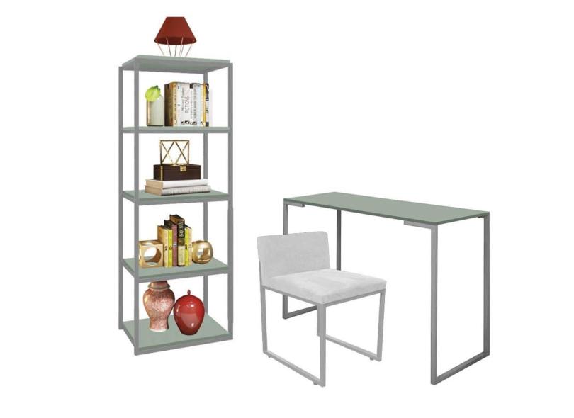 Kit Escritório Ravi 1 Cadeira Suede Branco com 1 Mesa e 1 Livreiro Ferro Cinza MDF Verde Oliva - Ahazzo Móveis