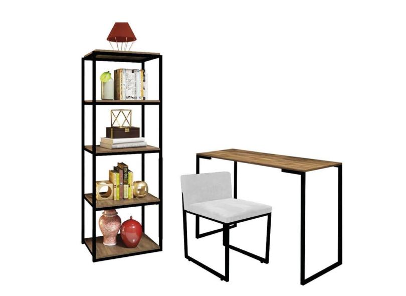 Kit Escritório Ravi 1 Cadeira Suede Branco com 1 Mesa e 1 Livreiro Ferro Preto MDF Carvalho - Ahazzo Móveis