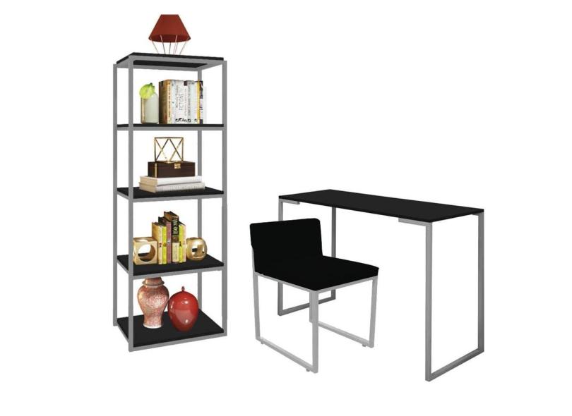 Kit Escritório Ravi 1 Cadeira Suede Preto com 1 Mesa e 1 Livreiro Ferro Prata MDF Preto - Ahazzo Móveis