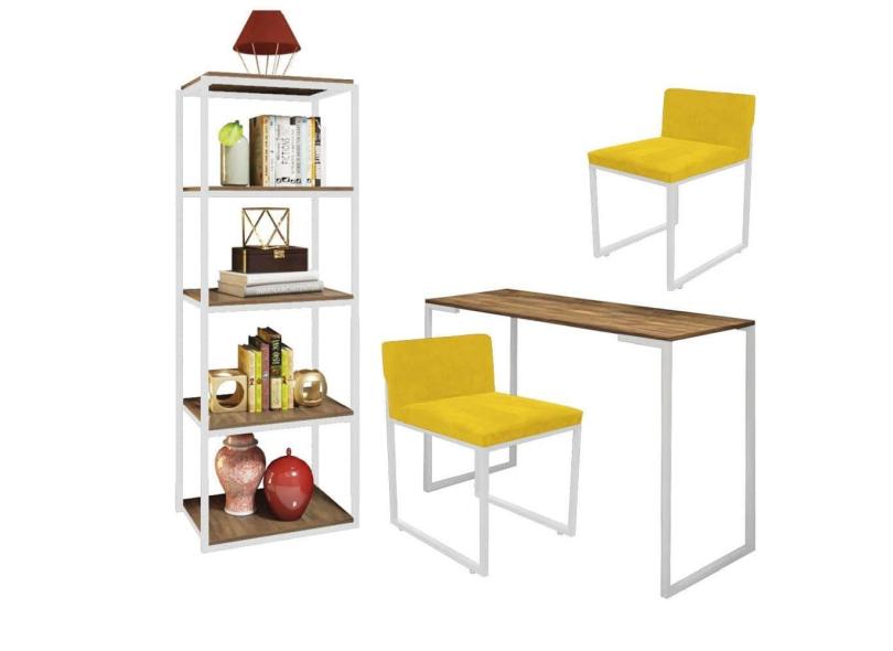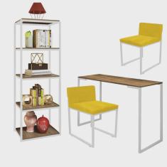 Kit Escritório Ravi 2 Cadeiras Suede Amarelo com 1 Mesa e 1 Livreiro Ferro Branco MDF Malbec - Ahazzo Móveis