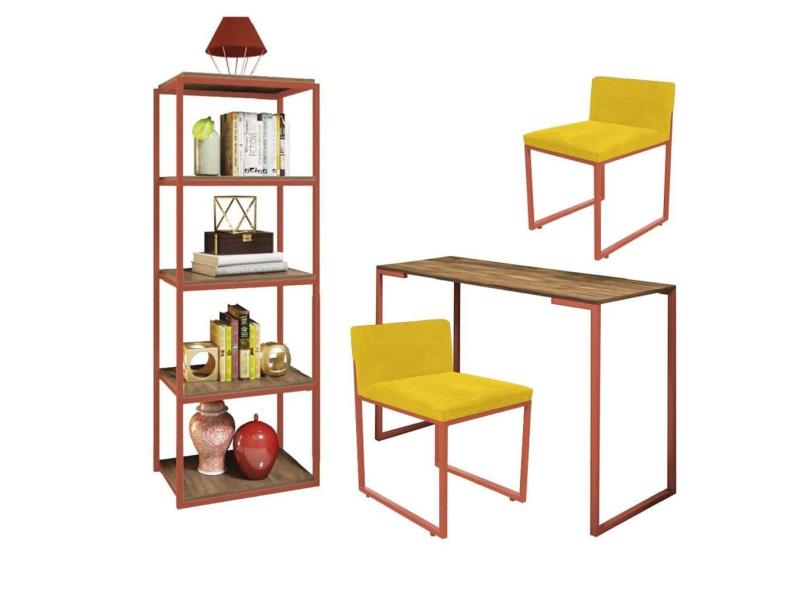Kit Escritório Ravi 2 Cadeiras Suede Amarelo com 1 Mesa e 1 Livreiro Ferro Bronze MDF Carvalho - Ahazzo Móveis