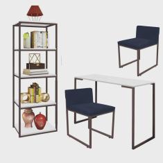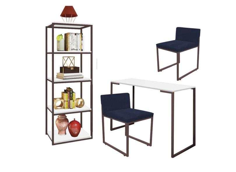 O menor preço encontrado no Brasil para Kit Escritório Ravi 2 Cadeiras Suede Azul Marinho com 1 Mesa e 1 Livreiro Ferro Marrom MDF Branco - Ahazzo Móveis atualmente é R$ 1.529,90.