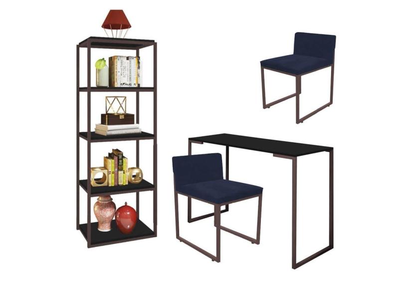 Kit Escritório Ravi 2 Cadeiras Suede Azul Marinho com 1 Mesa e 1 Livreiro Ferro Marrom MDF Preto - Ahazzo Móveis