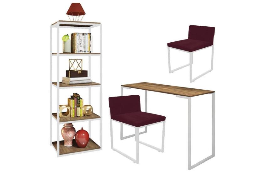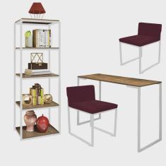 Kit Escritório Ravi 2 Cadeiras Suede Bordô com 1 Mesa e 1 Livreiro Ferro Branco MDF Caramelo - Ahazzo Móveis