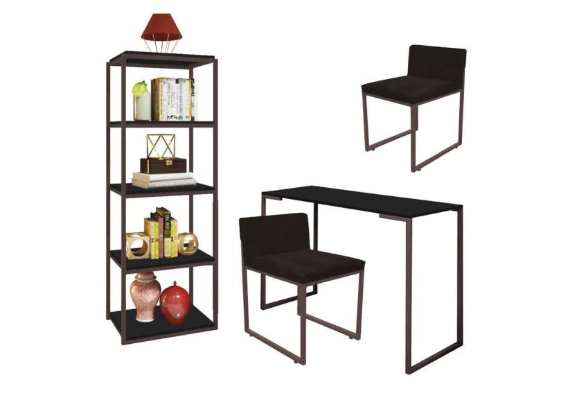 Kit Escritório Ravi 2 Cadeiras Suede Marrom com 1 Mesa e 1 Livreiro Ferro Marrom MDF Preto - Ahazzo Móveis