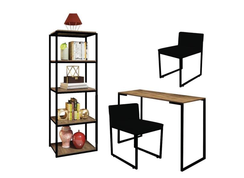 Kit Escritório Ravi 2 Cadeiras Suede Preto com 1 Mesa e 1 Livreiro Ferro Preto MDF Caramelo - Ahazzo Móveis