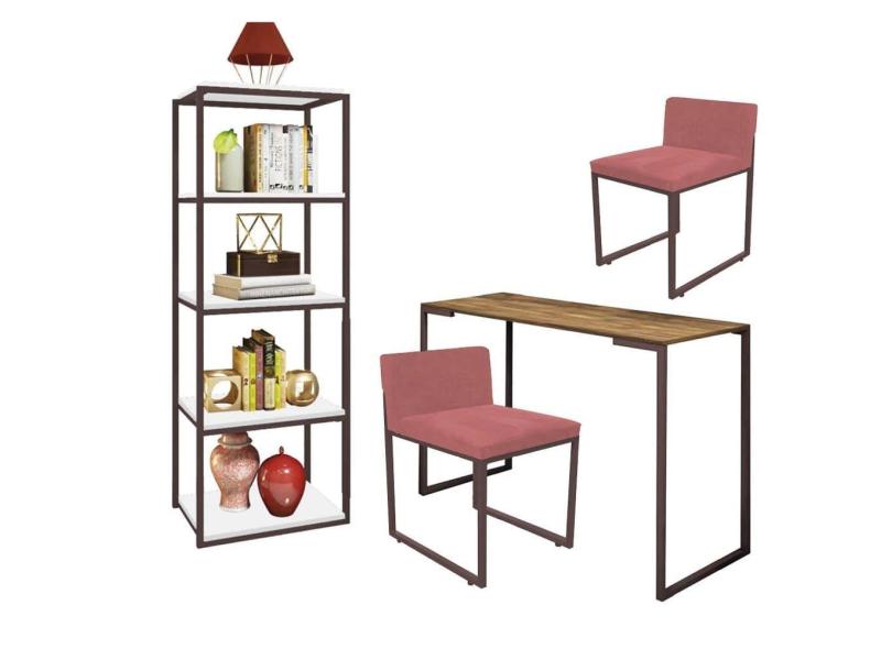 Kit Escritório Ravi 2 Cadeiras Suede Rose com 1 Mesa e 1 Livreiro Ferro Marrom MDF Rústico - Ahazzo Móveis