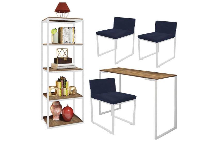 O menor preço encontrado no Brasil para Kit Escritório Ravi 3 Cadeiras Suede Azul Marinho com 1 Mesa e 1 Livreiro Ferro Branco MDF Carvalho - Ahazzo Móveis atualmente é R$ 2.049,90.