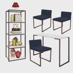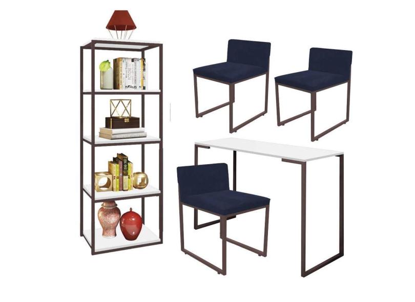 Kit Escritório Ravi 3 Cadeiras Suede Azul Marinho com 1 Mesa e 1 Livreiro Ferro Marrom MDF Branco - Ahazzo Móveis