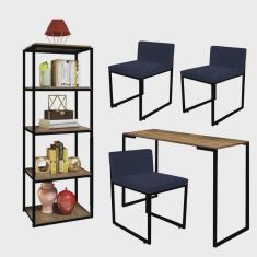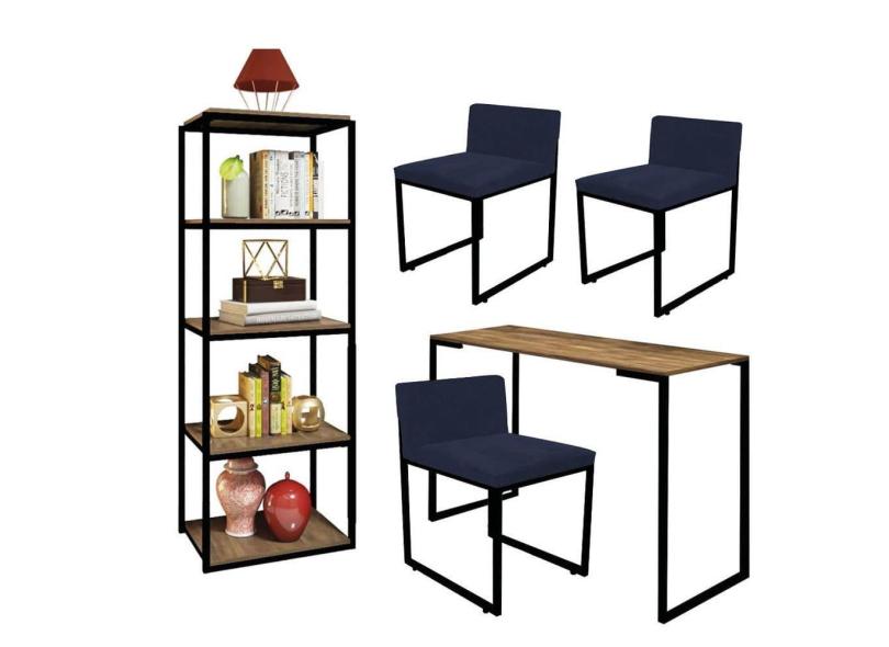 Kit Escritório Ravi 3 Cadeiras Suede Azul Marinho com 1 Mesa e 1 Livreiro Ferro Preto MDF Carvalho - Ahazzo Móveis