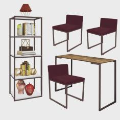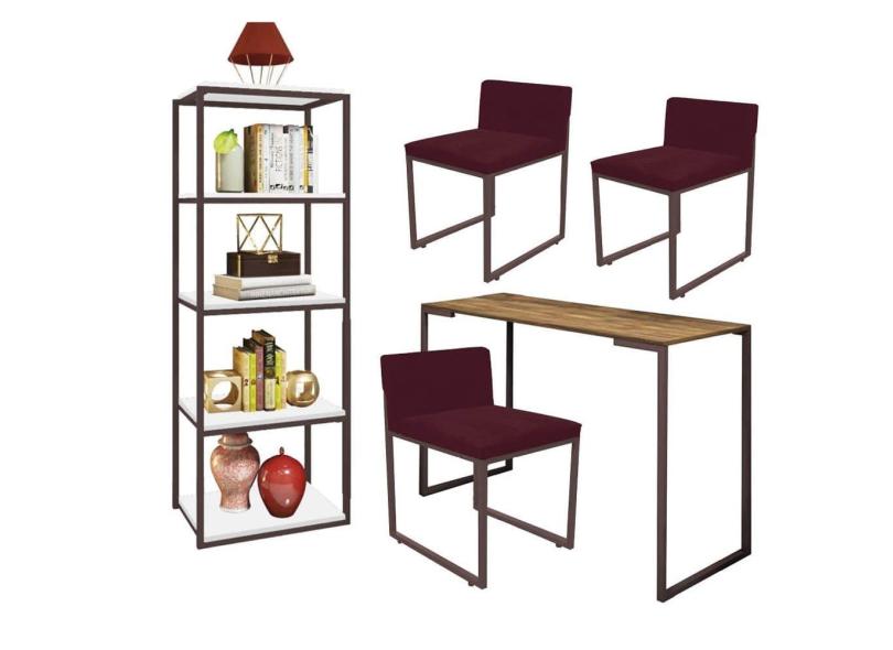 O menor preço encontrado no Brasil para Kit Escritório Ravi 3 Cadeiras Suede Bordô com 1 Mesa e 1 Livreiro Ferro Marrom MDF Caramelo - Ahazzo Móveis atualmente é R$ 2.049,90.