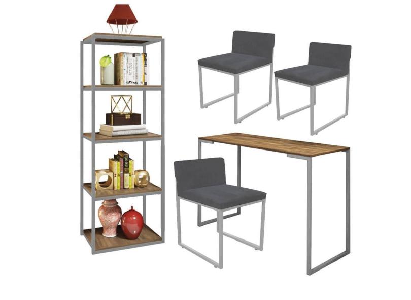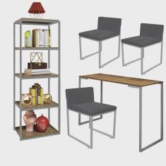 Kit Escritório Ravi 3 Cadeiras Suede Cinza com 1 Mesa e 1 Livreiro Ferro Cinza MDF Carvalho - Ahazzo Móveis