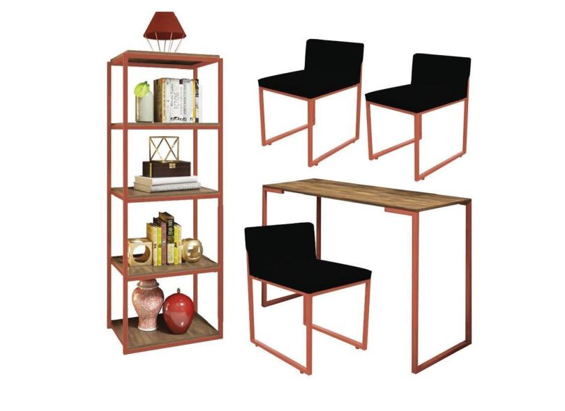 O menor preço encontrado no Brasil para Kit Escritório Ravi 3 Cadeiras Suede Preto com 1 Mesa e 1 Livreiro Ferro Bronze MDF Rústico - Ahazzo Móveis atualmente é R$ 2.049,90.