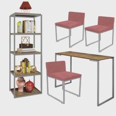 Kit Escritório Ravi 3 Cadeiras Suede Rose com 1 Mesa e 1 Livreiro Ferro Cinza MDF Caramelo - Ahazzo Móveis