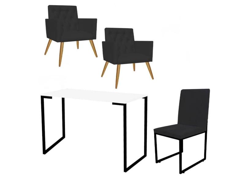 Kit Escritório Stan 2 Poltronas Capitonê com Cadeira e Mesa Industrial Branco Preto Tecido Sintético Preto - Ahz Móveis
