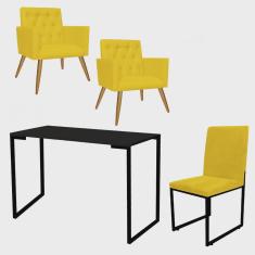 Kit Escritório Stan 2 Poltronas Capitonê com Cadeira e Mesa Industrial Tampo Preto Corino Amarelo - Ahz Móveis