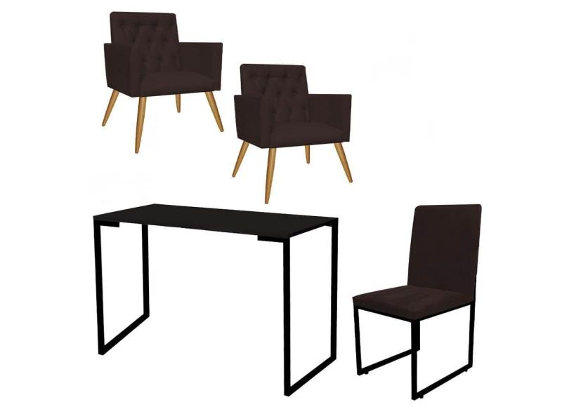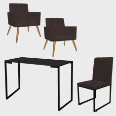 Kit Escritório Stan 2 Poltronas Capitonê com Cadeira e Mesa Industrial Tampo Preto Tecido Sintético Marrom - Ahz Móveis