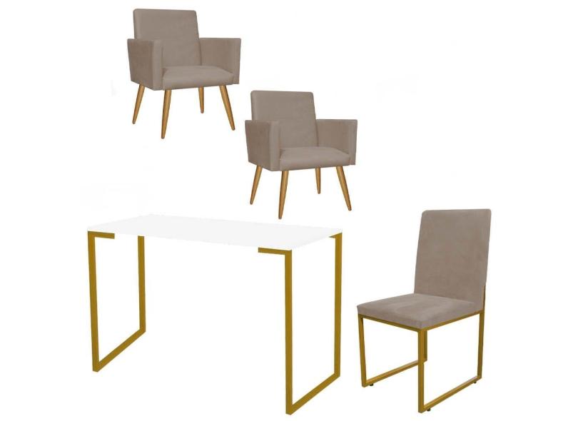 Kit Escritório Stan 2 Poltronas com Cadeira e Mesa Industrial Tampo Branco Dourado Tecido Sintético Bege - Ahz Móveis