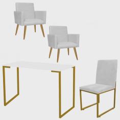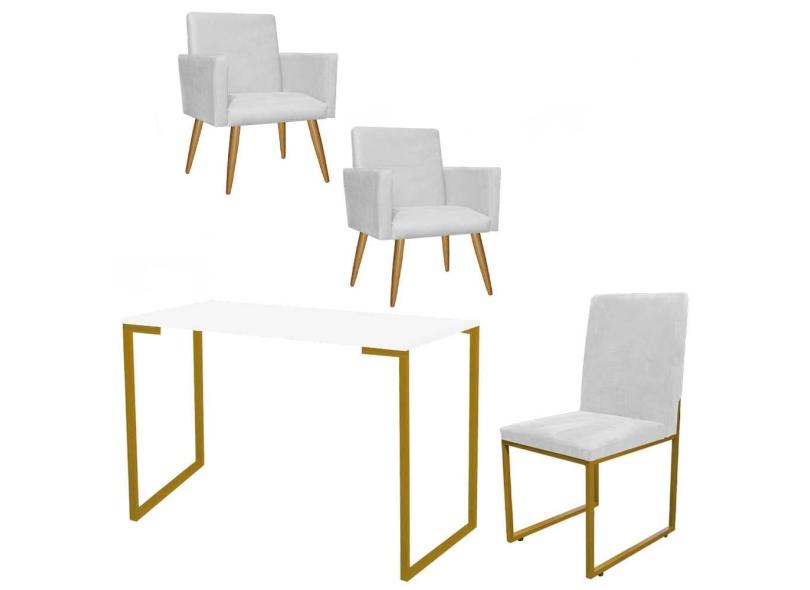 O menor preço encontrado no Brasil para Kit Escritório Stan 2 Poltronas com Cadeira e Mesa Industrial Tampo Branco Dourado Tecido Sintético Branco - Ahz Móveis atualmente é R$ 1.439,90.