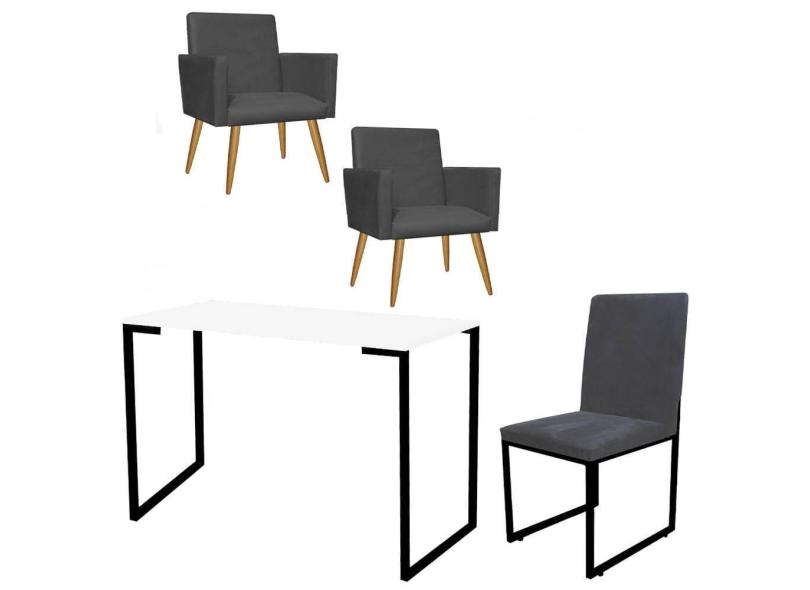 Kit Escritório Stan 2 Poltronas com Cadeira e Mesa Industrial Tampo Branco Preto Suede Cinza - Ahz Móveis