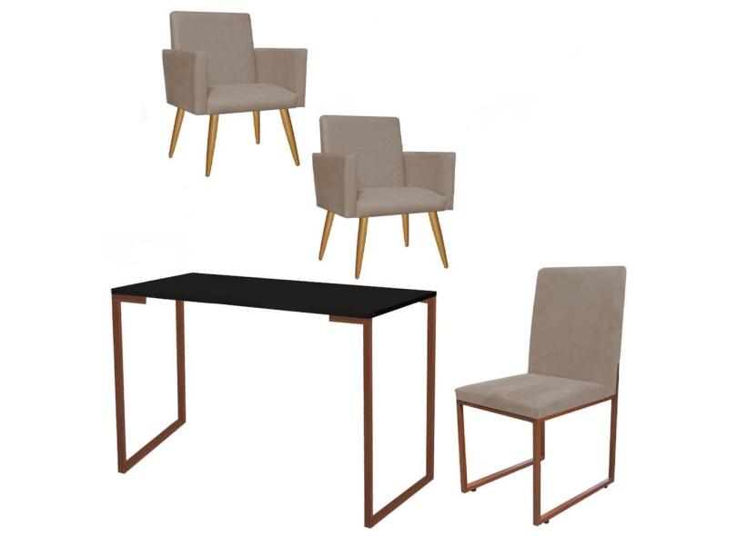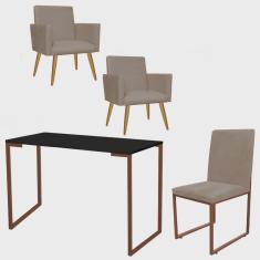 Kit Escritório Stan 2 Poltronas com Cadeira e Mesa Industrial Tampo Preto Bronze Tecido Sintético Bege - Ahz Móveis