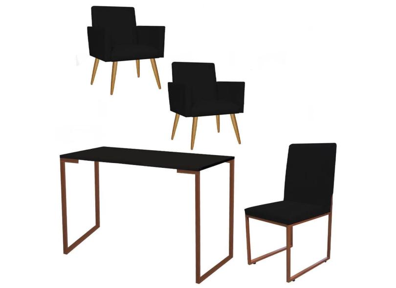 Kit Escritório Stan 2 Poltronas com Cadeira e Mesa Industrial Tampo Preto Bronze Tecido Sintético Preto - Ahz Móveis