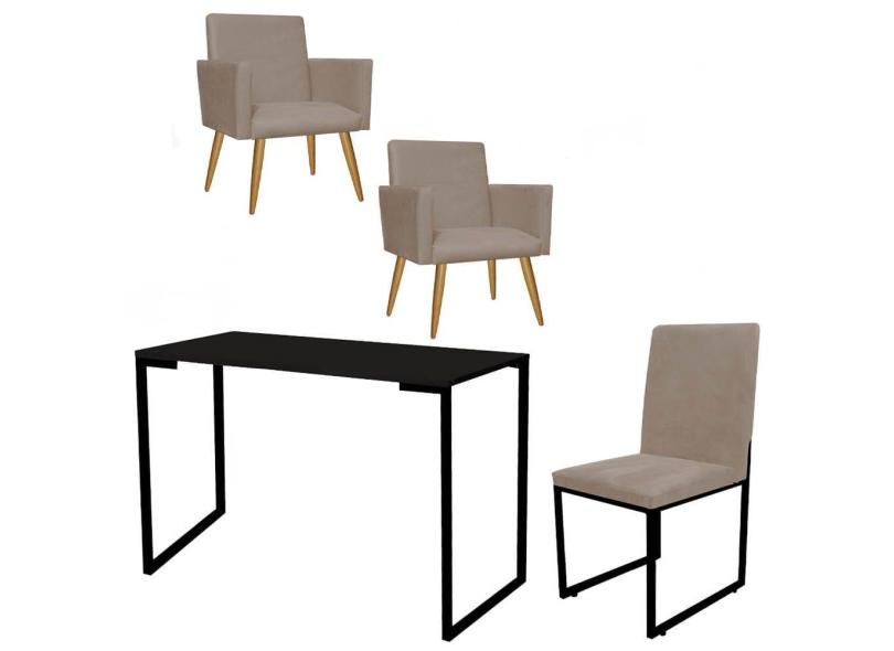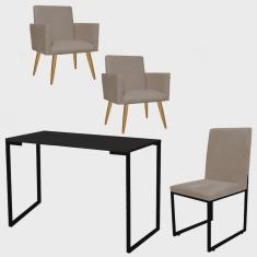 Kit Escritório Stan 2 Poltronas com Cadeira e Mesa Industrial Tampo Preto Tecido Sintético Bege - Ahz Móveis