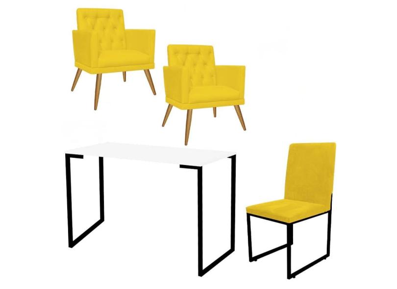 Kit Escritório Stan 2 Poltronas Maria com Cadeira e Mesa Industrial Branco Preto Suede Amarelo - Ahz Móveis