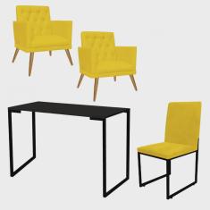 Kit Escritório Stan 2 Poltronas Maria com Cadeira e Mesa Industrial Tampo Preto Tecido Sintético Amarelo - Ahz Móveis