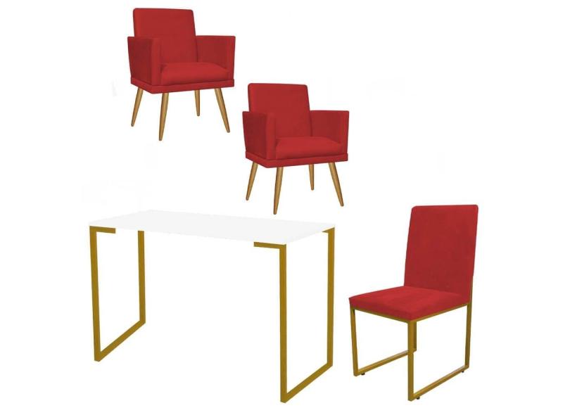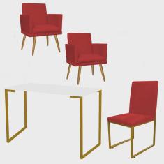 Kit Escritório Stan 2 Poltronas Rodapé com Cadeira e Mesa Industrial Branco Dourado Corino Vermelho - Ahz Móveis