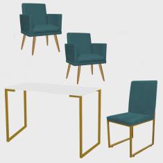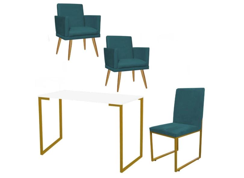 O menor preço encontrado no Brasil para Kit Escritório Stan 2 Poltronas Rodapé com Cadeira e Mesa Industrial Branco Dourado Suede Azul Turquesa - Ahz Móveis atualmente é R$ 1.479,90.