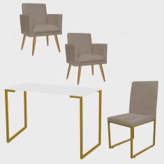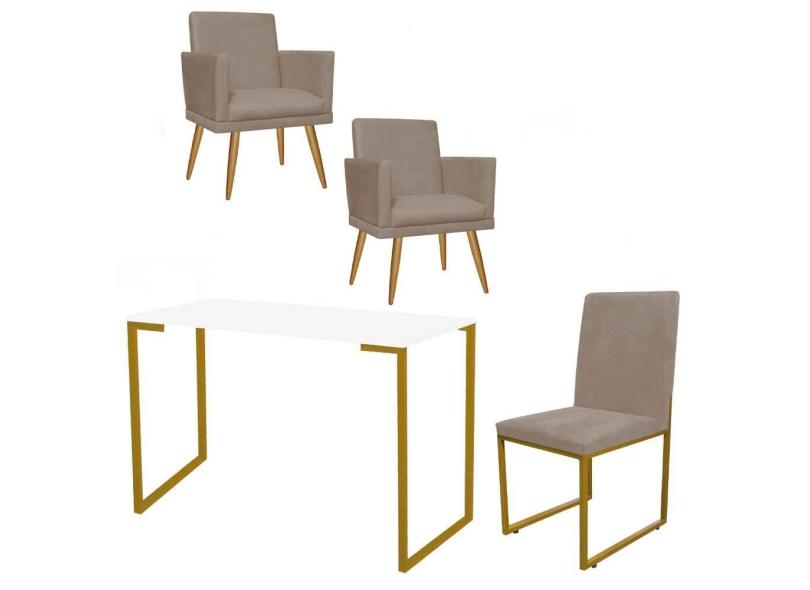 Kit Escritório Stan 2 Poltronas Rodapé com Cadeira e Mesa Industrial Branco Dourado Suede Bege - Ahz Móveis
