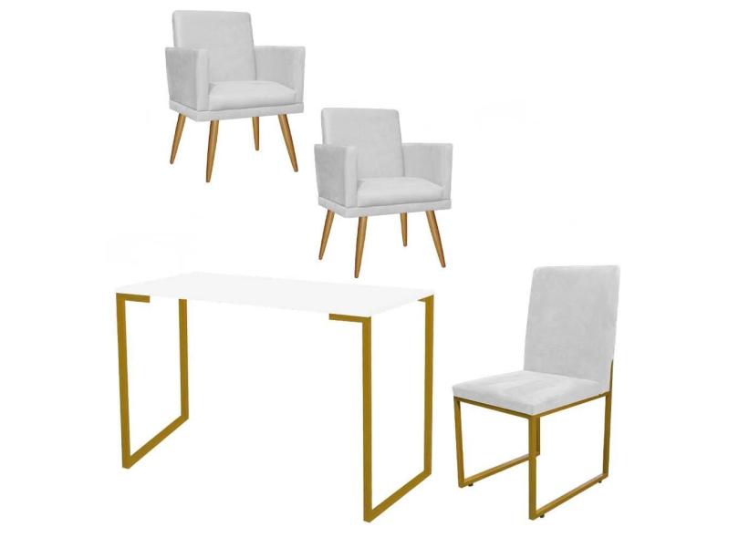 O menor preço encontrado no Brasil para Kit Escritório Stan 2 Poltronas Rodapé com Cadeira e Mesa Industrial Branco Dourado Tecido Sintético Branco - Ahz Móveis atualmente é R$ 1.479,90.
