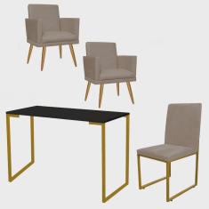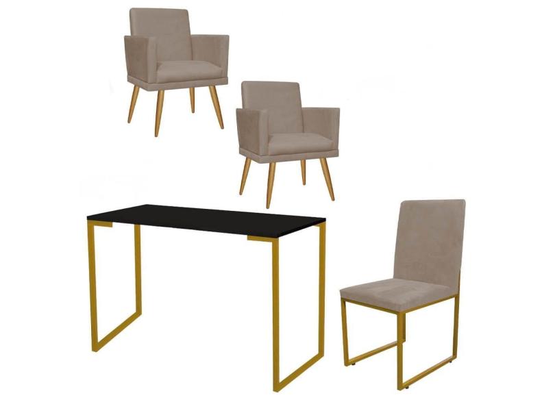 Kit Escritório Stan 2 Poltronas Rodapé com Cadeira e Mesa Industrial Preto Dourado Tecido Sintético Bege - Ahz Móveis