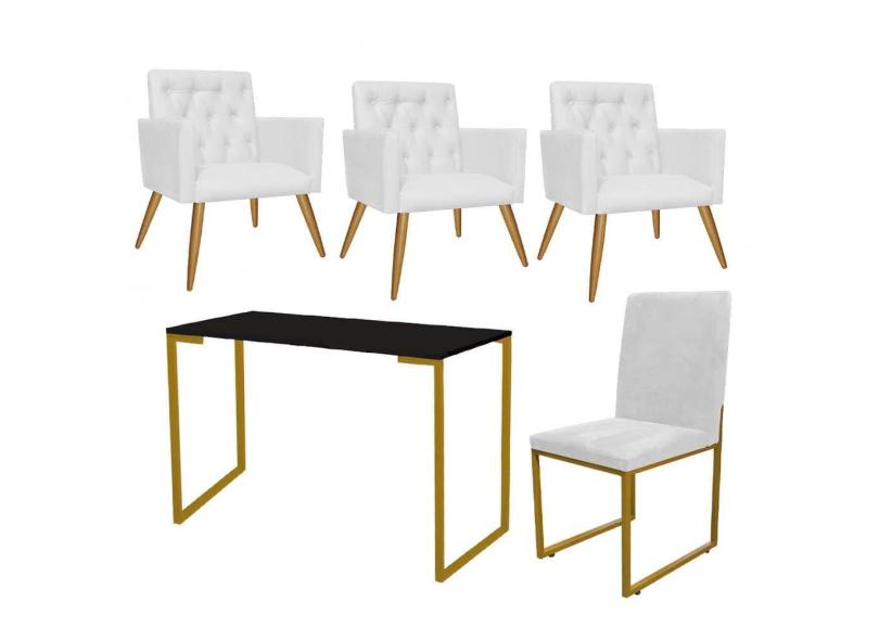 Kit Escritório Stan 3 Poltronas Capitonê com Cadeira e Mesa Industrial Preto Dourado Corino Branco - Ahz Móveis