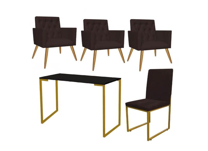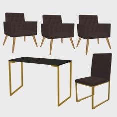 Kit Escritório Stan 3 Poltronas Capitonê com Cadeira e Mesa Industrial Preto Dourado Suede Marrom - Ahz Móveis