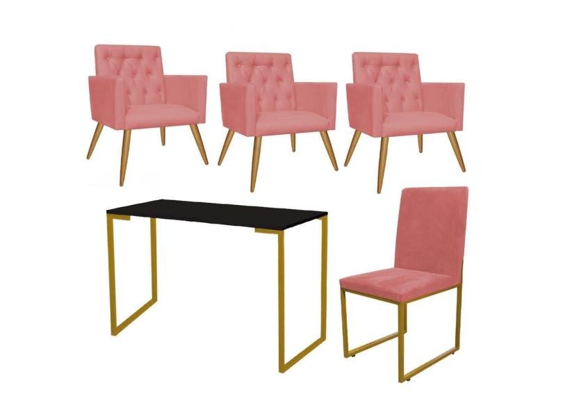 Kit Escritório Stan 3 Poltronas Capitonê com Cadeira e Mesa Industrial Preto Dourado Suede Rose Gold - Ahz Móveis