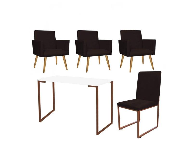 Kit Escritório Stan 3 Poltronas com Cadeira e Mesa Industrial Tampo Branco Bronze Suede Marrom - Ahz Móveis