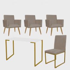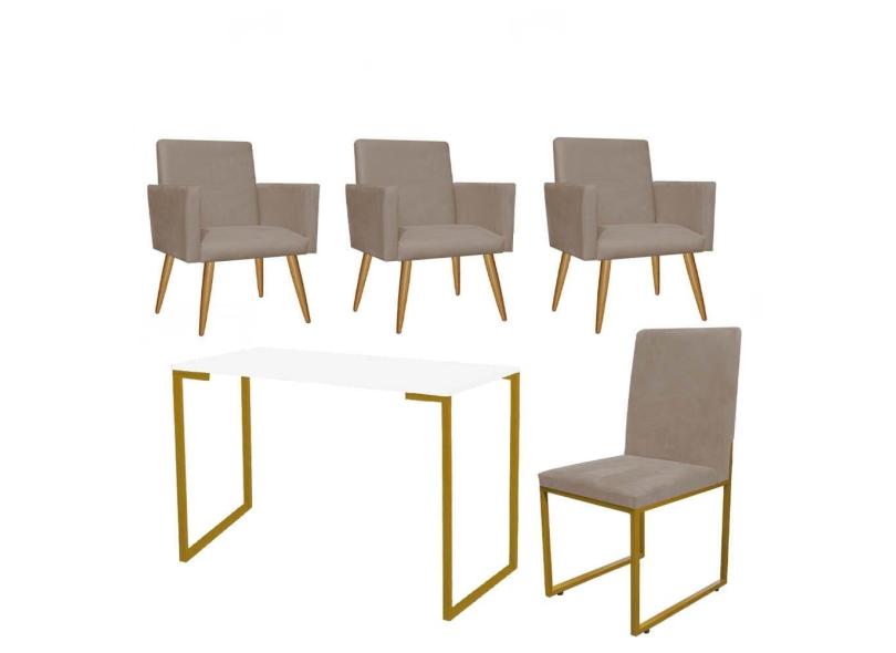 Kit Escritório Stan 3 Poltronas com Cadeira e Mesa Industrial Tampo Branco Dourado Corino Bege - Ahz Móveis