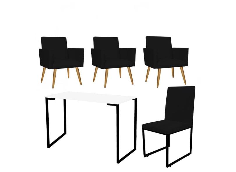 Kit Escritório Stan 3 Poltronas com Cadeira e Mesa Industrial Tampo Branco Preto Tecido Sintético Preto - Ahz Móveis