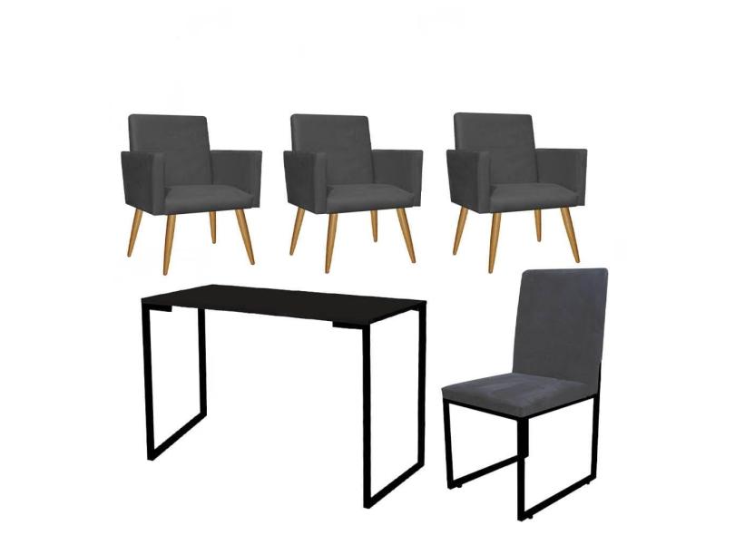 Kit Escritório Stan 3 Poltronas com Cadeira e Mesa Industrial Tampo Preto Suede Cinza - Ahz Móveis
