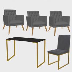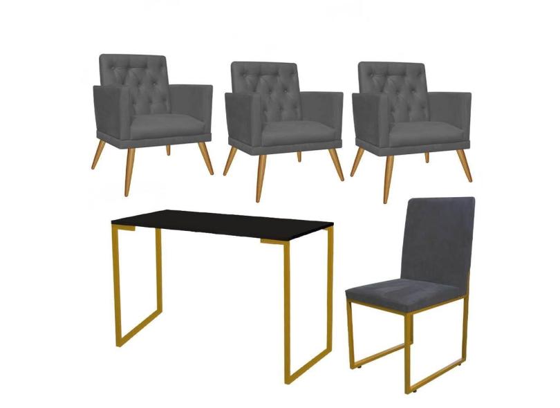Kit Escritório Stan 3 Poltronas Maria com Cadeira e Mesa Industrial Preto Dourado Tecido Sintético Cinza - Ahz Móveis
