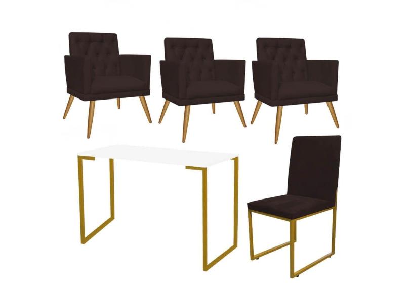 Kit Escritório Stan 3 Poltronas Maria e Cadeira e Mesa Industrial Branco Dourado Corino Marrom - Ahz Móveis