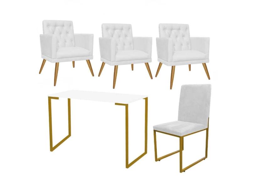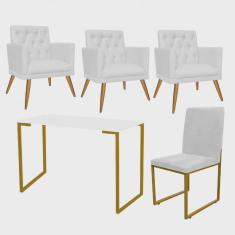 Kit Escritório Stan 3 Poltronas Maria e Cadeira e Mesa Industrial Branco Dourado Tecido Sintético Branco - Ahz Móveis